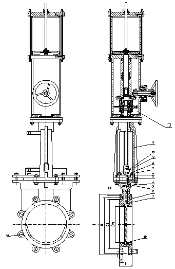 2.3 气缸上端的升降杆标志刀闸阀的闸板是处于提升状态还是下降状态。带闸阀关闭时,外伸指示杆处于最低位置;反之,闸阀全开时,外伸指示杆处于最高位置。此即为本阀启闭状态的现场指示。