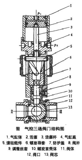 如图 1,气控三通阀门的结构气控三通阀门由上、中、下 3 部分组成,上部为一双作用气缸,中部为一旋转部组件,下部为一三通球阀。活塞 2 在气缸上端时,Ⅰ腔与Ⅱ腔相通,当气源从 P1 进入气缸时,气缸中活塞 2 在气压的作用下向下运动,活塞杆 3 带动滚柱 5 沿螺旋导套壳体导向槽向下运动使螺旋导套 6 旋转,当活塞 2 向下运动至气缸下端时,螺旋导套旋转 90°,螺旋导套带动球阀阀杆 8 旋转 90°,阀芯 13 旋转 90°,这样Ⅰ腔与Ⅱ腔隔离,Ⅰ腔与Ⅲ腔相通。